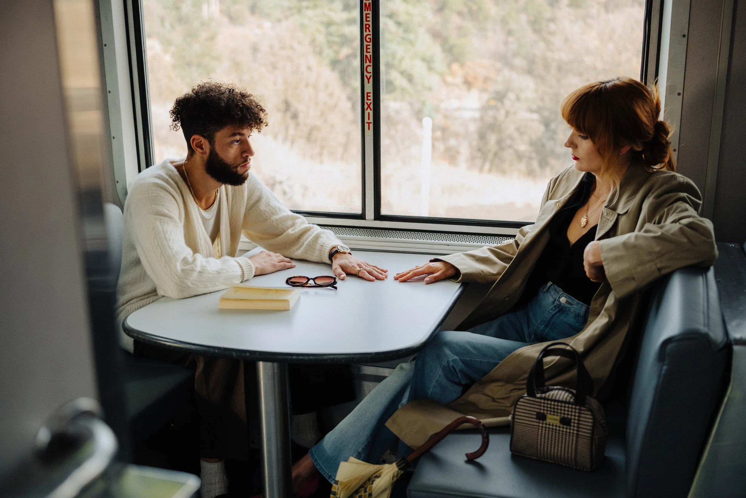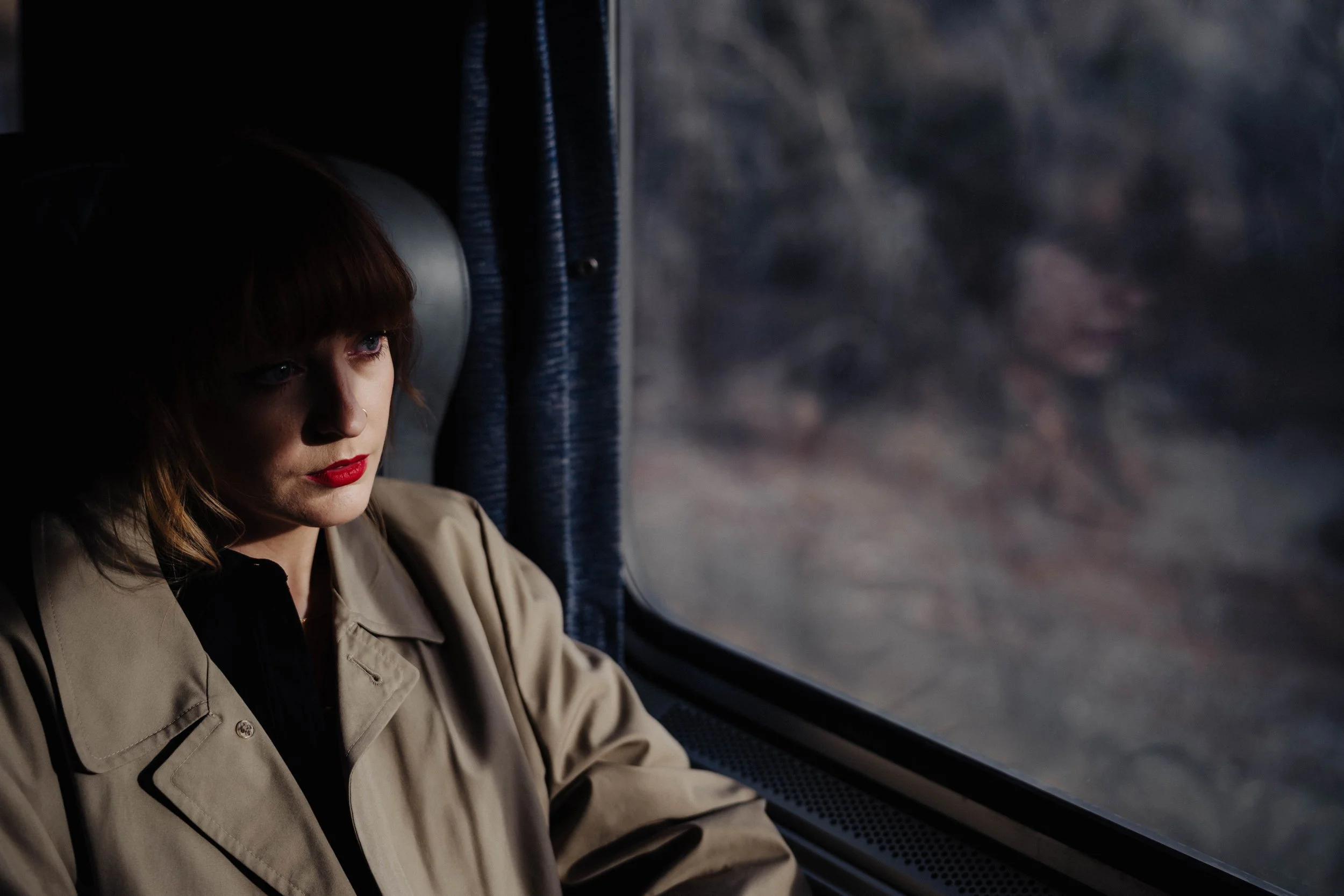 Day Two – we lucked out and was able to reschedule the train tickets for Sunday morning. We head to the train, fully re dolled up and ready to rock. We have one hour to capture what we had been working on for weeks. My vision to provoke the love lost emotion was now or never. I saw glimpses of it the day before, but something was missing. It was the light – I need the glow to be surrounding them at different times, looks, scenes. . . I need the obsession in my head to be realized. . . then . . . Kat looked to the left out the train window, then down. The sun came through, highlighting just half of her face. . . nailed it. I couldn’t believe I got the emotion I wanted. There’s this feeling where you obsession is completed but you know there’s still more (definition of obsession) We move to the middle of the train, where one box car meets the other box car. The obnoxious light from the exit sign added to the dramatic illustrative and only to promote the cinematic visuals. An intimate, almost, but not quite look, touch, feeling. A love that cannot not happen. SNAP – nailed it again. We cruised the train and got several shots in different areas. The casual dining area was prefect for an almost touch of the hands. Glenn has a sharp look that radiates strong emotions. He understood this assignment. We finish up the hour and snap a few shots outside the train. Coming down from a high – well mostly I forget to breath I was so excited. This felt so much of a journey that was longing, but when the seduction of the destination arrives – we know that the love will end. Almost mirrors the passion for photography.